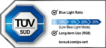 TÜV SÜD düşük mavi ışık sertifikası ile uzun izleme seanslarından sonra gözlerinizi korumak için mavi ışık emisyonunu azaltır.